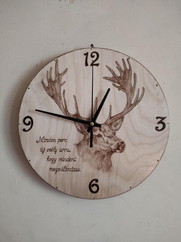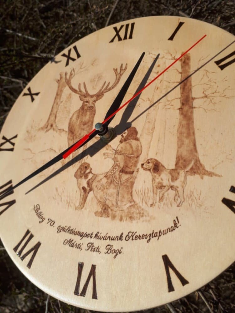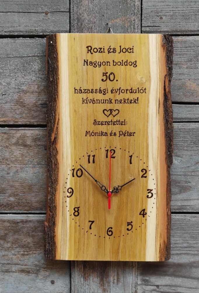 Gyönyörű akácfa szeletre, kézzel gravírozott egyedi falióra, melyet bármilyen alkalomra, saját elképzelésed szerint készítek el.