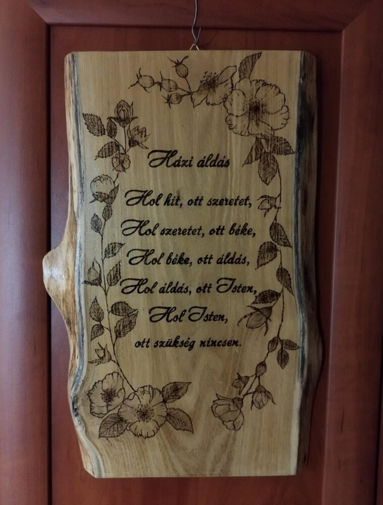 Akácfa szeletre kézzel rajzoltam, és gravíroztam ezt a Házi áldást.